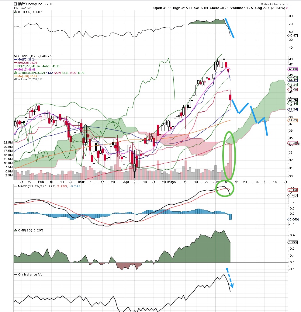 What goes up often comes back down, even for a short period of time. That is what we see in Chewy's CHWY chart.