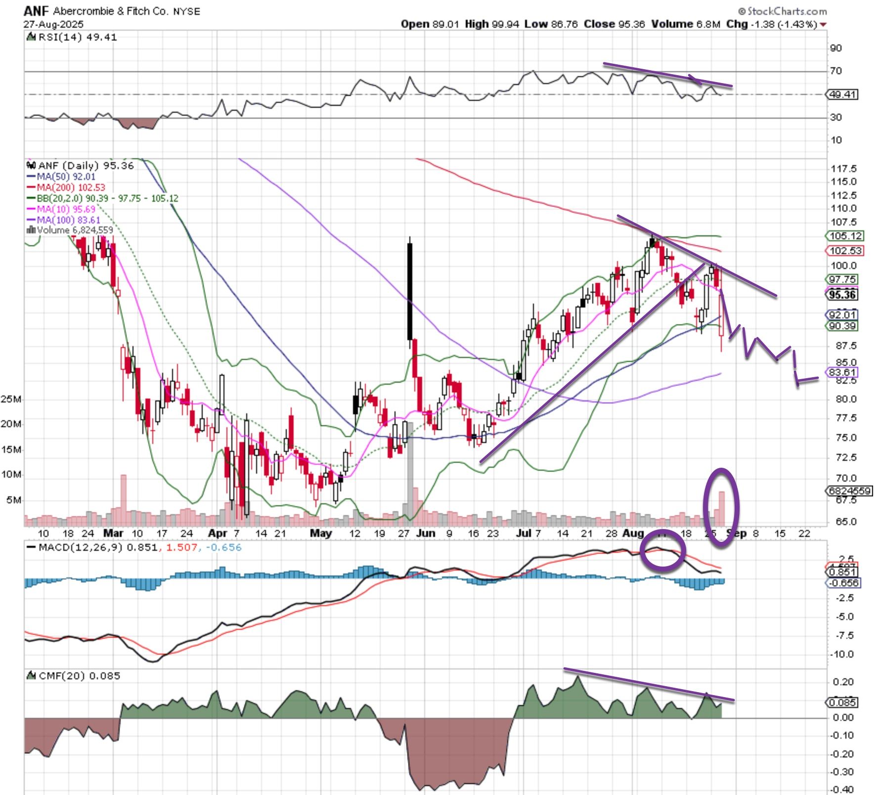 Back in May we see the huge bar from Abercrombie & Fitch ANF, when the company released earnings that seemed good, but ended up being start of a mini downtrend. As the stock tried to recover those severe losses over the last few months, it was yet another poor earnings call that dropped the stock hard this past week. A pop below the 200-day moving average is not bullish, further a pattern of lower highs, lower lows on the chart is also quite bearish.