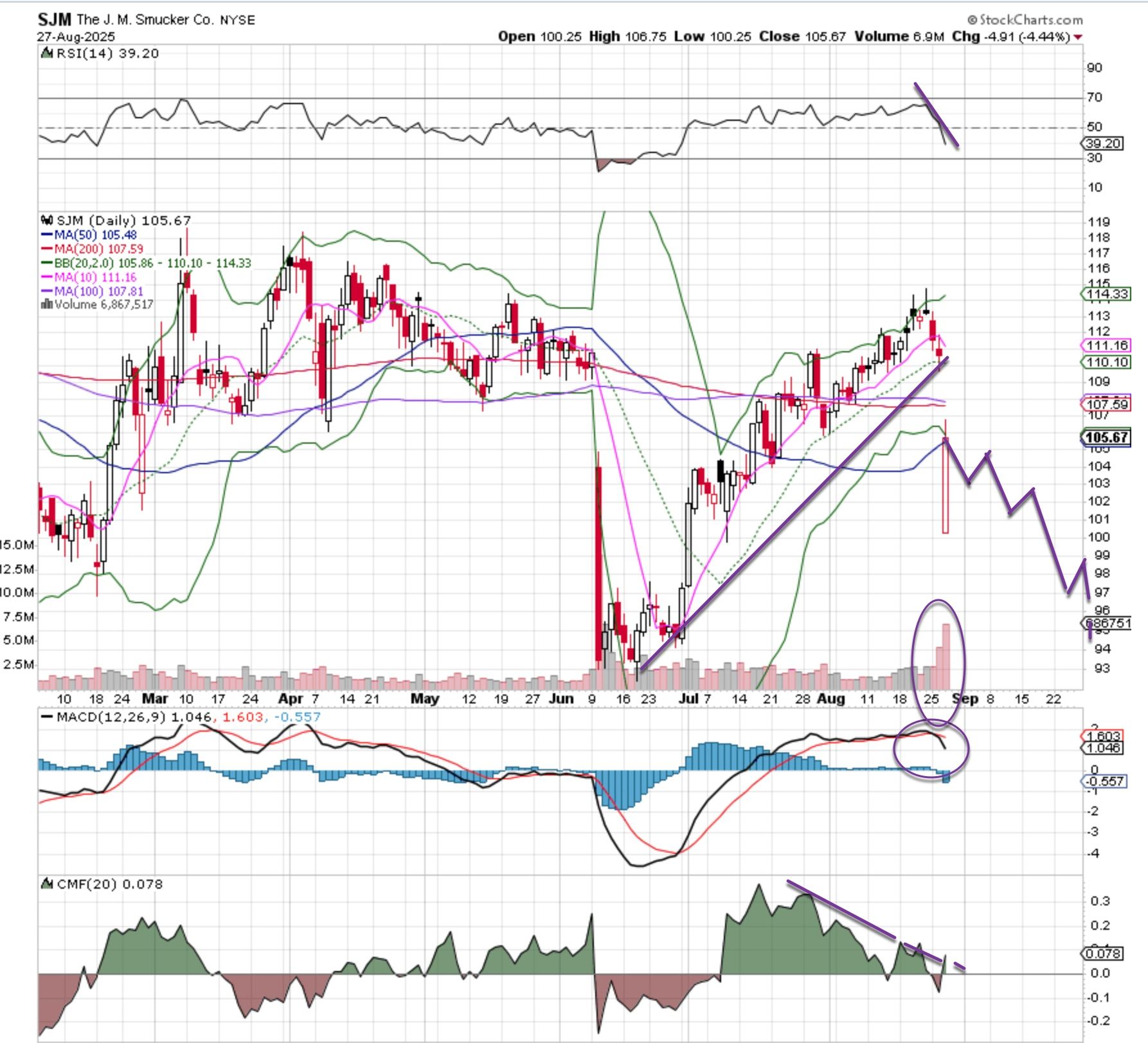 All that is washed away now, big heavy selling has taken over and the indicators are bearish. The Moving Average Convergence Divergence is rolling over for a sell signal while money flow has clearly been leaking. Let's target the low $90 area, short term and eventually a move below the June lows to the mid-$80s. We'll stop out on a close above $113.