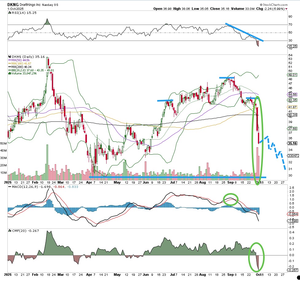 We see a bearish chart pattern playing out on DraftKings (DKNG) , and that is a head/shoulders. Notice the blue lines in the top of the chart, a reliable bearish pattern that won't likely finish for a couple more weeks. There is some more downside though, if you can believe it. Bulls are not wagering heavily on DraftKings.