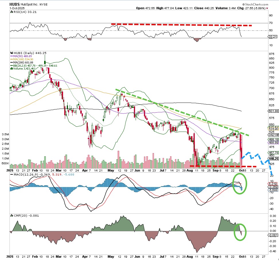 A clear downtrend in place for Hubspot (HUBS) and when it hits the downtrend line it is time to short more. That was the cue this week, but with this move down the stock has violated some good support. No question the trend is down, money flow is now bearish and the RSI, or relative strength index, is moving toward oversold. Remember, that does not mean the stock is a buy, in fact it is probably due for more selling.