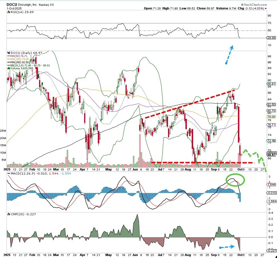 After falling so far, so fast the past few days can Docusign (DOCU) recover quickly? It's possible but not likely, the stock has been in mortal pain for days, and even while Docusign rallied for a month from August to September, it only took a few days to wipe out those gains. Brutal for the bulls.