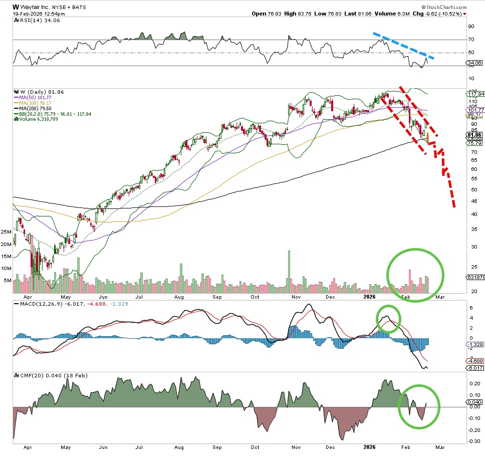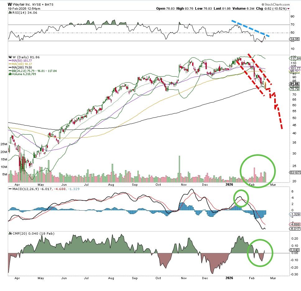 A break of the 200-day moving average by Wayfair (W) this week spells trouble. There is a saying on Wall Street: "nothing good happens under the 200-day MA," especially when a shocking move down below there occurs. Bulls are scrambling to sell, worried the stock may be headed further south.