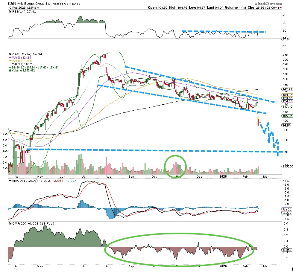A tough few months for Avis (CAR) , since breaking lower in August the stock has been on a smooth ride down. Lower highs, lower lows is our textbook definition of a downtrend. Money flow is weak and has been since the stock broke down hard last summer.
