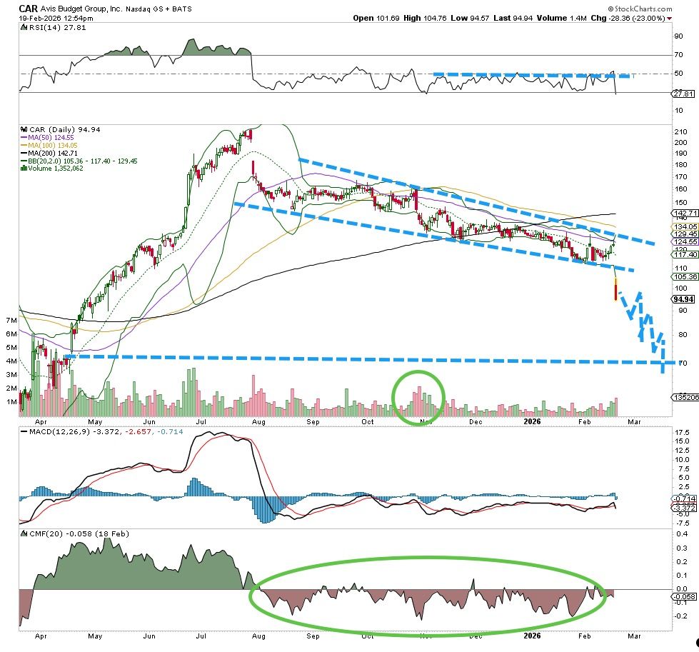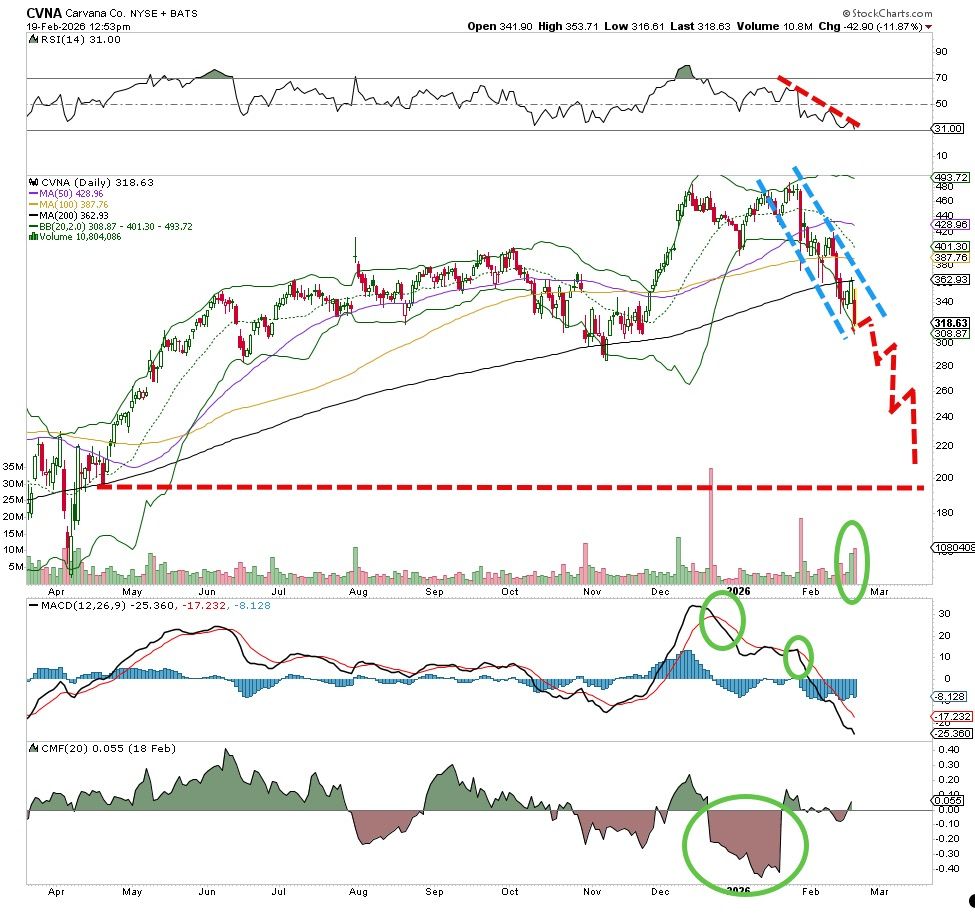 It has been very difficult year in 2026 for Carvana (CVNA) , a stock that just weeks ago was being touted by many as "teflon" and a "cannot sell" stock. Well, the opposite happened, February has been a forgettable month for Carvana, with a downtrend channel, lower highs and lower lows, which fits our definition of a downtrend.