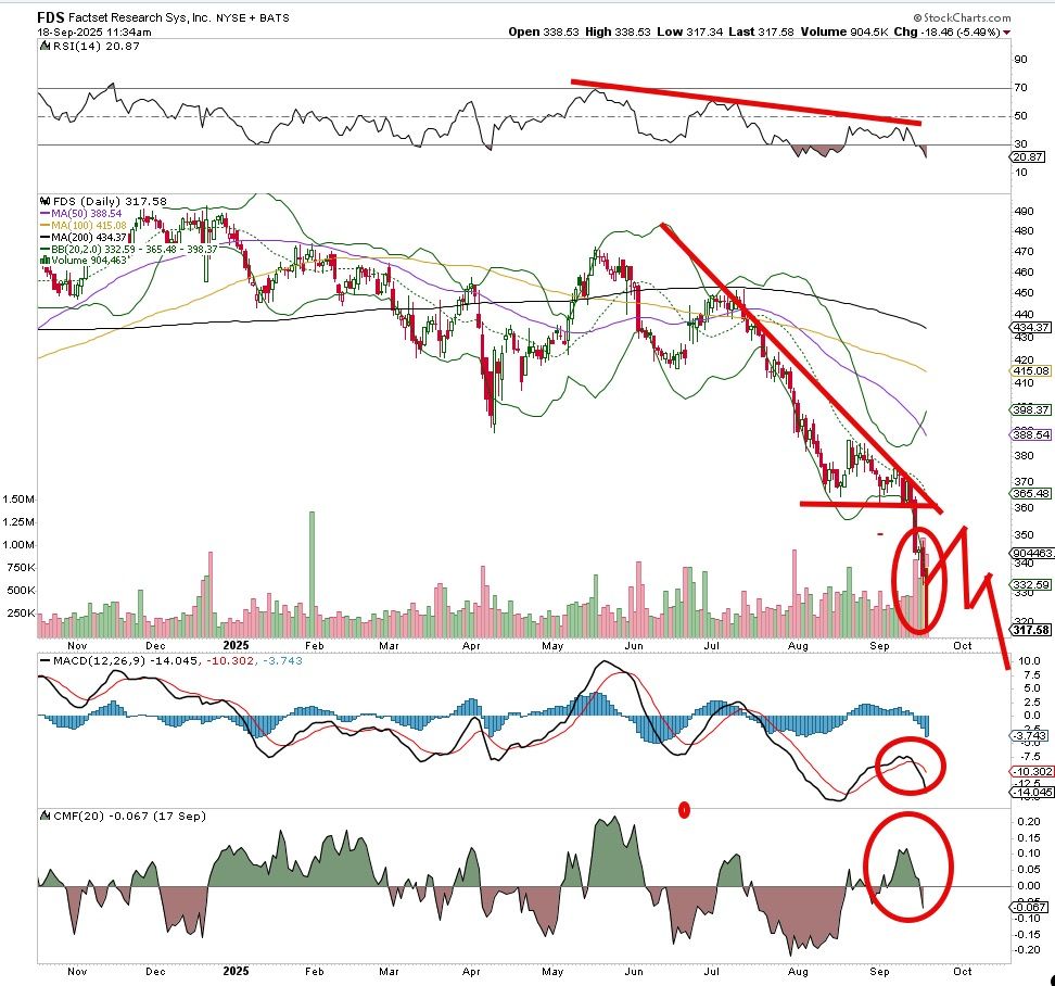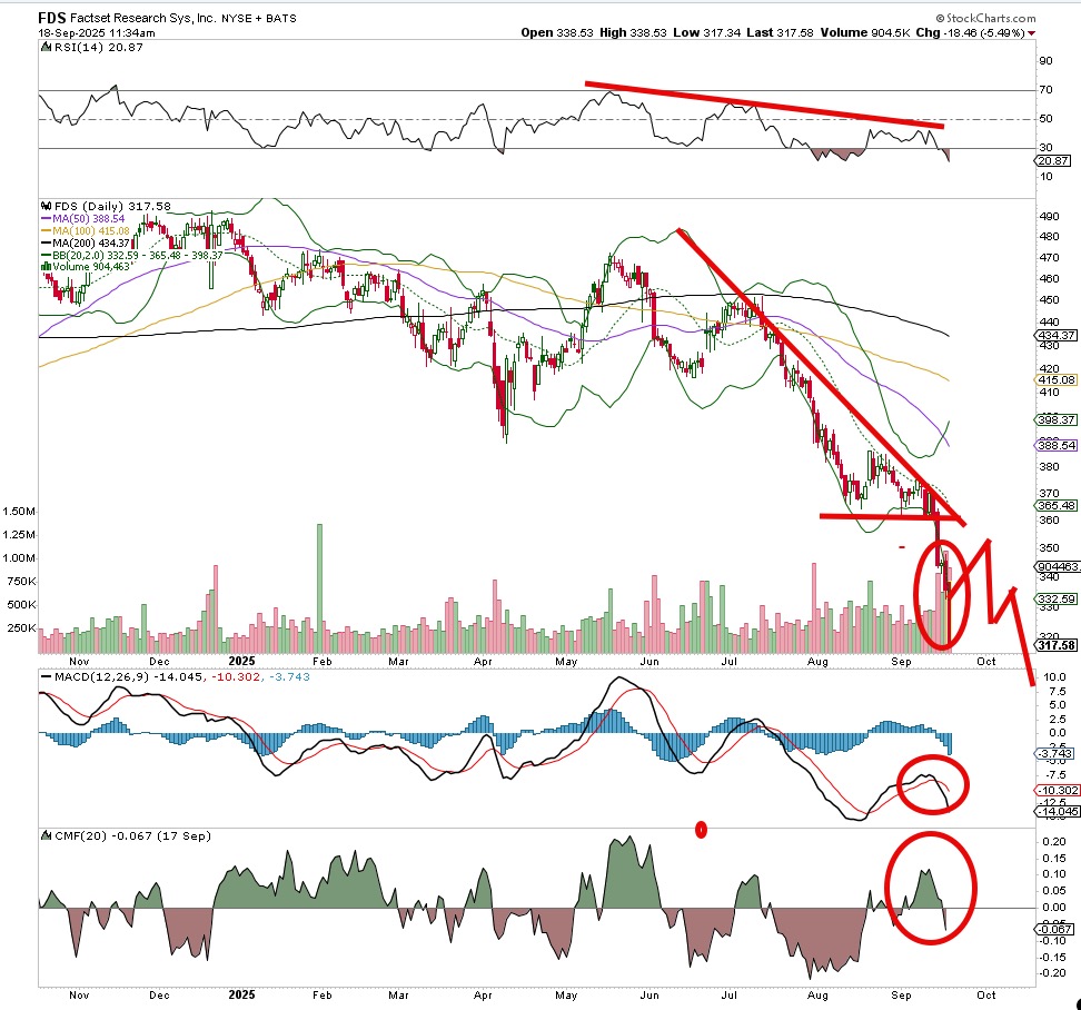 An ugly downtrend for Factset FDS continues to hit this stock with more sellers. The downtrend line was established in June and that led to a series of lower-highs, lower-lows -- our textbook definition of a downtrend. The worst part about this weak stock is the rest of the market is passing it up. Can it ever bounce and rise again? Sure, but at this point momentum is bearish and quite strong, until it can build a strong base the sellers are just going to hit the stock on every rise.