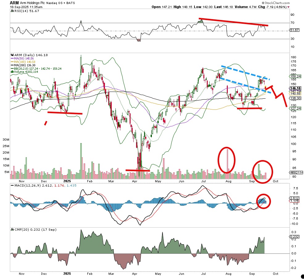 This high-growth semiconductor name had been moving up nicely this summer but now has suffered from severe sellingitis. Arm Holdings ARM has some "strong arm" holders to back the company but when there are sellers in the name they hit this one hard. We don't have a full-on sell signal yet, but I suspect it is coming and when it does this stock has nowhere to run, nowhere to hide.