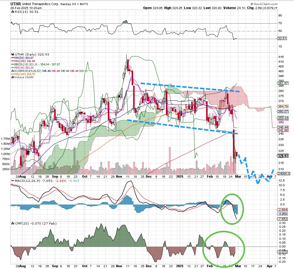 A monster down session for United Therapeutics UTHR this week has this company on the defensive. The stock had a huge volume day to the downside Wednesday, breaking a widening wedge pattern (drawn in) and finishing in the lower end of the range. The drop on heavy volume is the big money holders simply calling it quits and selling the stock. That often leads to lower prices, and we'll take advantage of it.