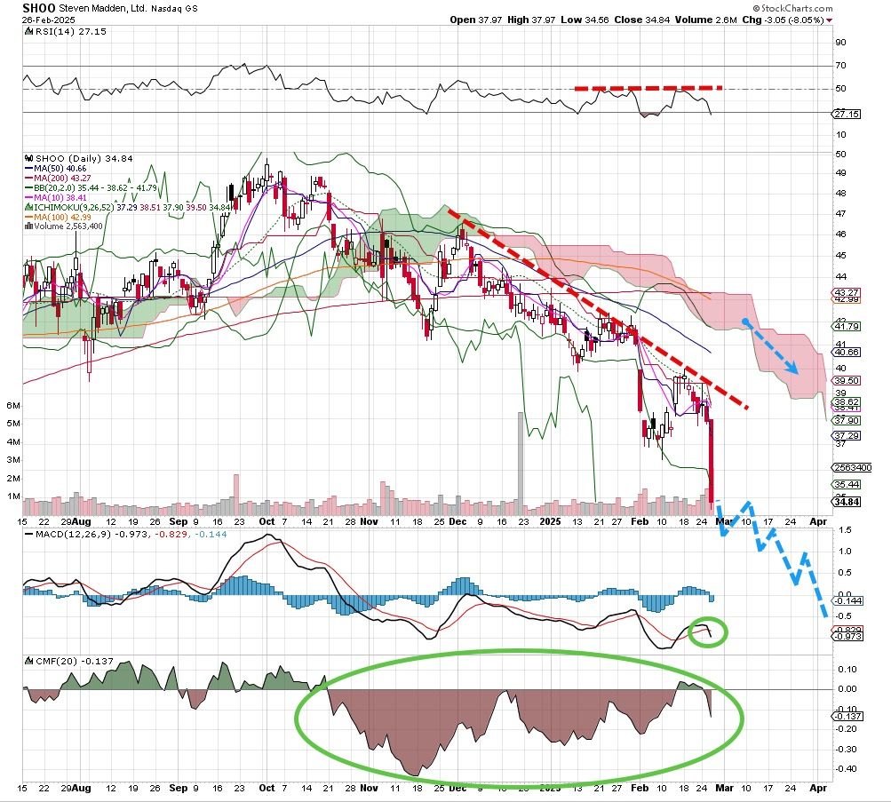 This fancy footwear retailer was once a high flying stock, then it went cold for some time and bounced back strong. Now Steven Madden SHOO is in a miserable downtrend, with lower-highs and lower-lows. That is the definition of stock moving down. Check out money flow, which is uber bearish. RSI shows that $50 level is difficult to penetrate. The cloud is red, and the high volume move this week says big money is exiting the stock quickly.