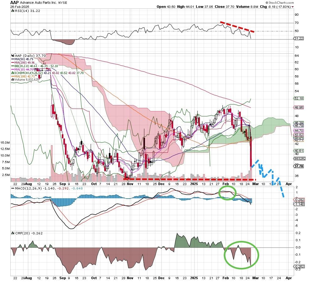 A massive drop on heavy volume in Advance Auto Parts AAP was had bulls checking their airbags and seat belts. The stock chart shows a massive bearish head/shoulders pattern created, where the right shoulder at $46 was broken and then the neckline at $40 was skidding like tires on ice. While the drop was big, there is significantly more downside action to come, especially after the October lows are penetrated.