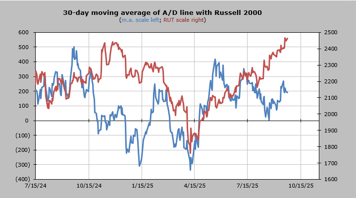 The 30-day moving average of the advance/decline line is overbought.