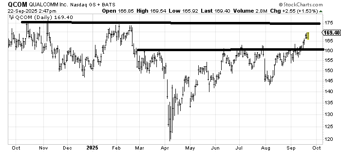 Qualcomm QCOM ought to make it to 175 after all the swing from 160 to 145 in August measures there, and we can see the resistance on the chart there. After that, I’d have to see how it looks once it gets up there.