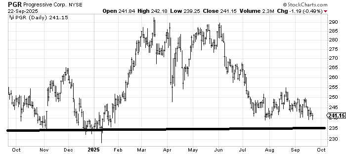 Progressive PGR, which I liked about a month ago, has gone nowhere. But it keeps bouncing off this 240-ish area. If it doesn’t start moving soon, it is going to become one of those tax-loss selling candidates.