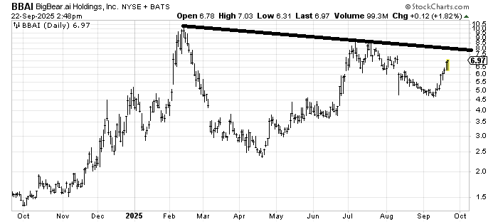BigBear.ai Holdings BBAI sounds like a made-up name to me, like Long Island Iced Tea Blockchain (that was a real name of a company once). That having been said, I would use a stop under 6 and look for resistance around 7.5-8.