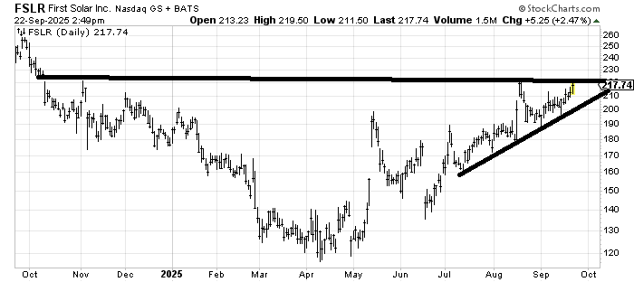 First Solar FSLR has resistance up here around 220, but as long as it stays over the uptrend line (around 200 currently) it is okay.
