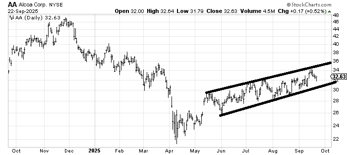 I am still interested in Alcoa AA, which is working this channel rather well since June.