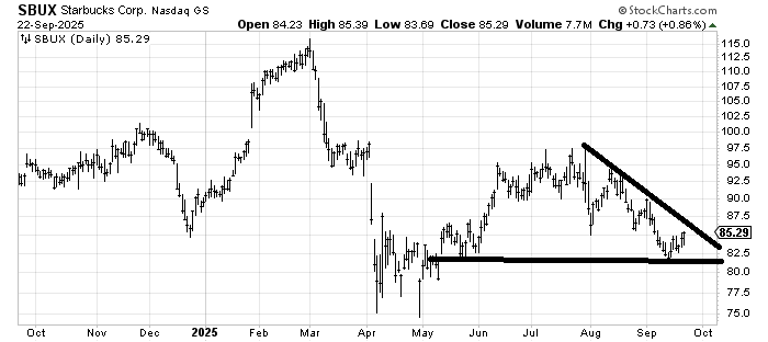 Starbucks SBUX has finally started to bounce. It has resistance all the way up, but get it over that downtrend line and it gets much more interesting.