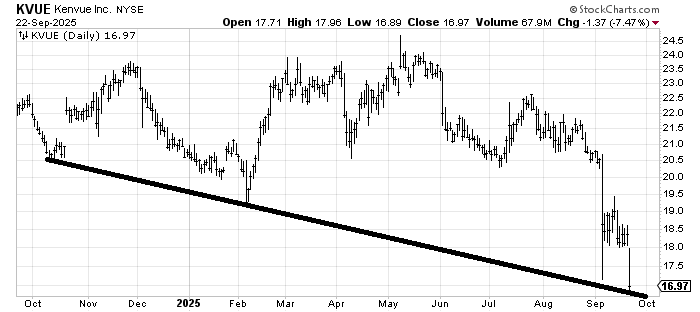 Someone asked about Kenvue KVUE last week, and I noted I have a view that spike lows tend to hold on the first strip down there. Obviously, the news is bad for it today, but if you are looking for a potential trade and don’t mind catching a falling knife, the 16-ish area should give a bounce.
