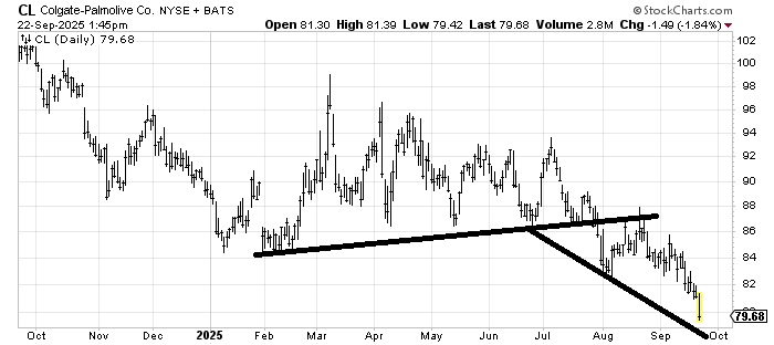 Yet once again, the indicators do not change. Everything sort of sits there while some stocks move with big air pockets. One of the air pockets today was Colgate CL, a chart I highlighted on the negative side about a week or so ago. It plunged.