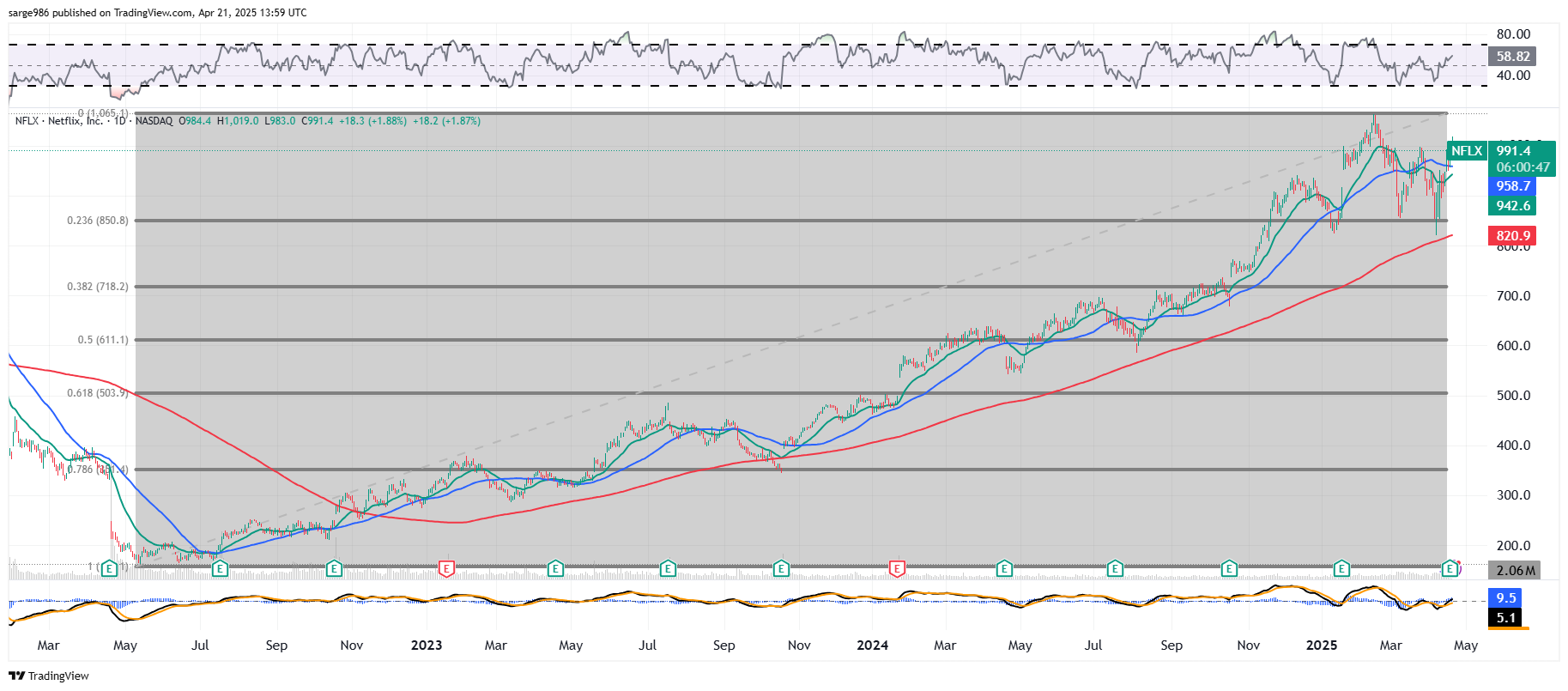 Readers will see that NFLX found support recently at an almost perfect 23.6% Fibonacci retracement of the rally that has more or less been in place since spring of 2022. Now, look to the upper right-hand corner of the most recent action and check this out: