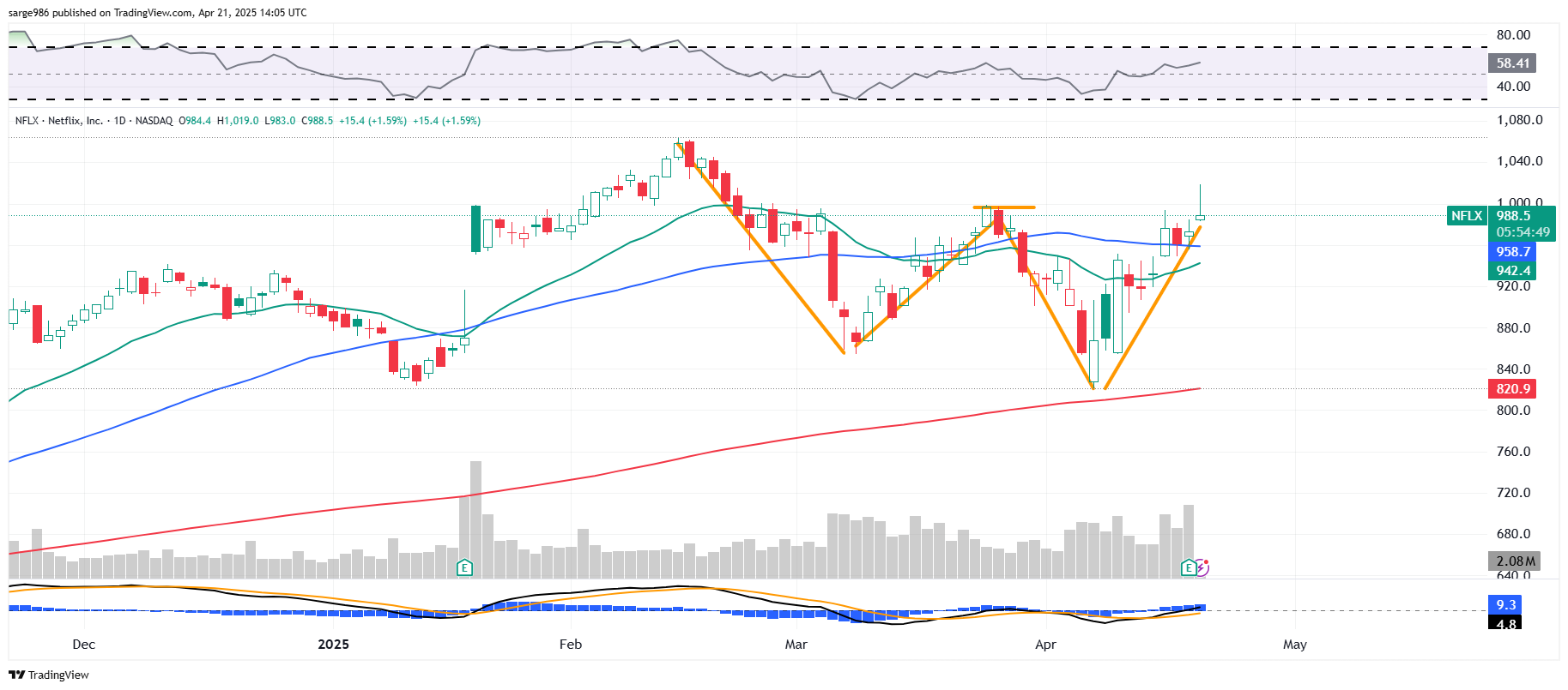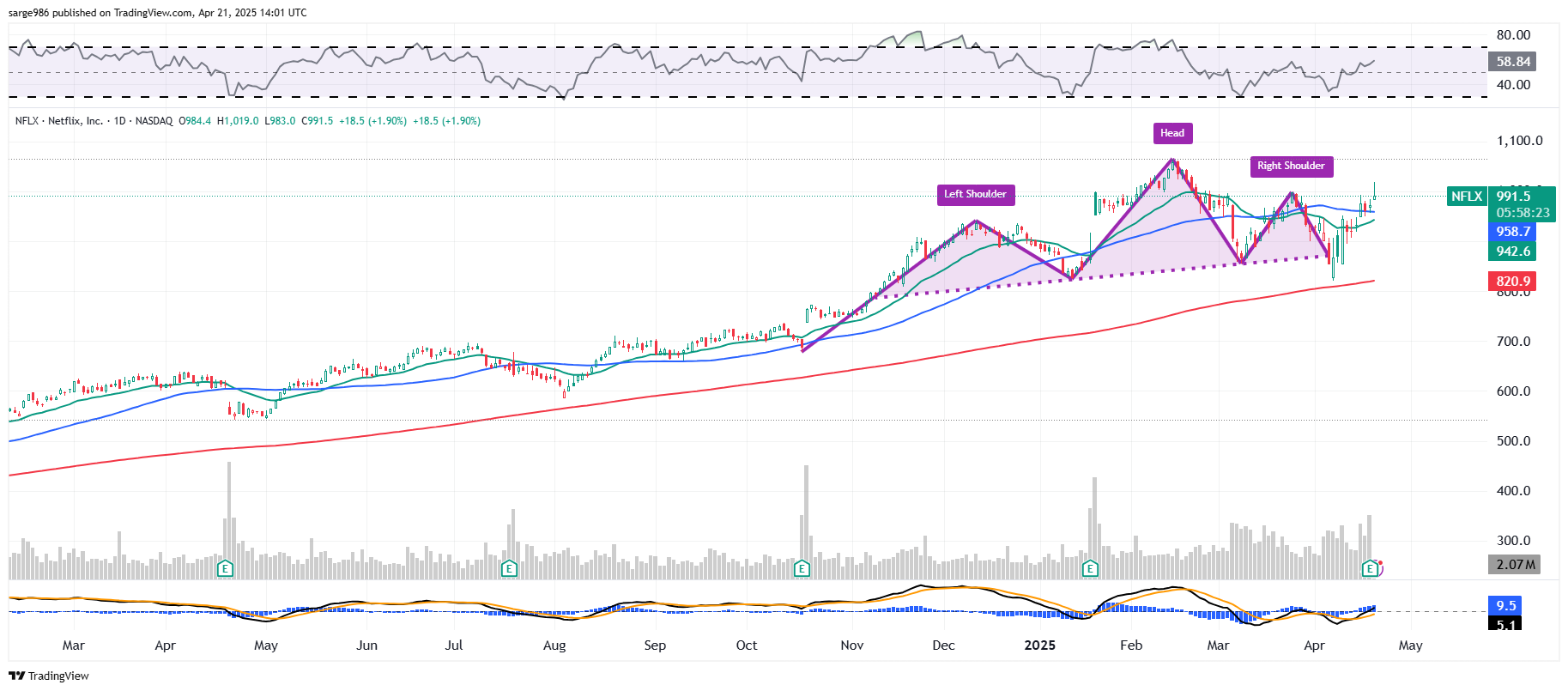 If the head and shoulders was not respected, and the stock, which is not likely to be impacted by tariffs at all, is set to become something of an internet/communications sector refuge for investors, are we looking at a double-bottom pattern at the top of the chart? We may be, with a $998 pivot. Now, I have not been a fan of NFLX in the past and it has often cost me, if not in dollars and cents, at least in time and effort as I had to trade my way out of trouble.