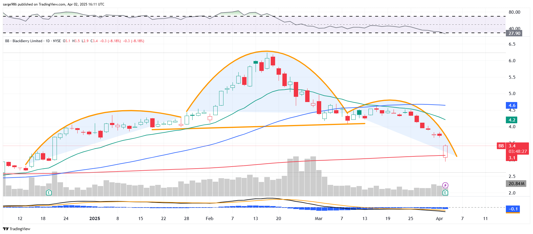 Readers will see that from late 2024 through to the present, BlackBerry built a head-and-shoulders pattern with a neckline at about $4.10. That means that the selloff might be close to done in his name, for now. If one was short, the target likely would have been reached this morning. Additionally, the 200-day simple moving average (SMA), which is where the pattern began in early December, showed up as support.