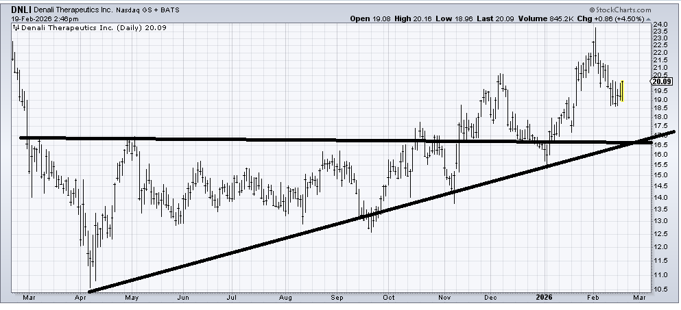 Denali Therapeutics (DNLI) is a nice chart that looks okay into this pullback. A stop seems quite far away, though (under 16), so that is not helpful. But if it can rally now (it should), but cannot get up and over that spike high at 23.50, I would get concerned.