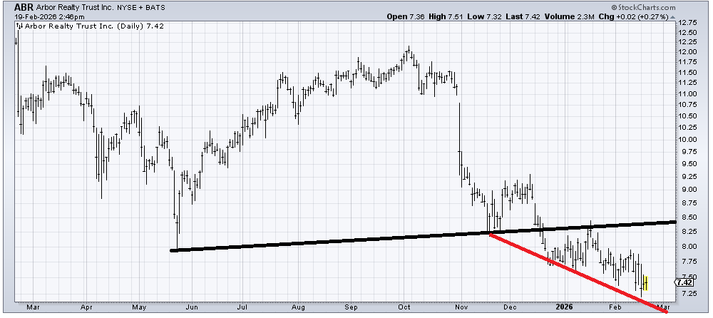 I don’t see much in the chart of Arbor Realty Trust (ABR) to get excited about. It’s a stock in a downtrend. The only good news is that it bounced off that red line. And it keeps bouncing off it. It would need to form a base to get me thinking it has stopped going down and is ready to do more. I have a measured target in the 5.50 area.