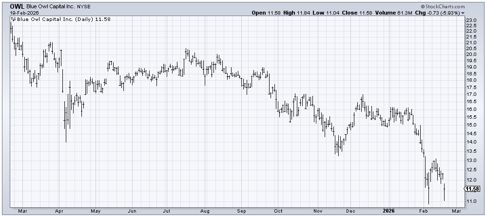 We have discussed the asset manager stocks before, as a sign that something was amiss. Something is still probably amiss there. But I do want to keep an eye on Blue Owl (OWL) , which had bad news today and did not make a lower low. Not yet, at least. The same way I still have my eye on 51 on the XLF chart, I am watching these asset managers for signs the selling is finally done.