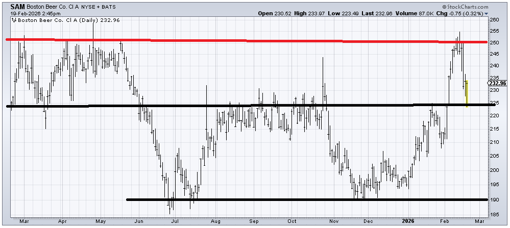 The natural instinct is to draw in this black line on the chart of Boston Beer (SAM) and say, okay bouncing off support. I think it does bounce off support. But I think the bounce is likely to fail. That move up to 255 last week, I think, is more likely than not to cap the upside on any rally (red line). I’ll call it a trading range for now because the stock has a history of spiking up and having little follow-through.