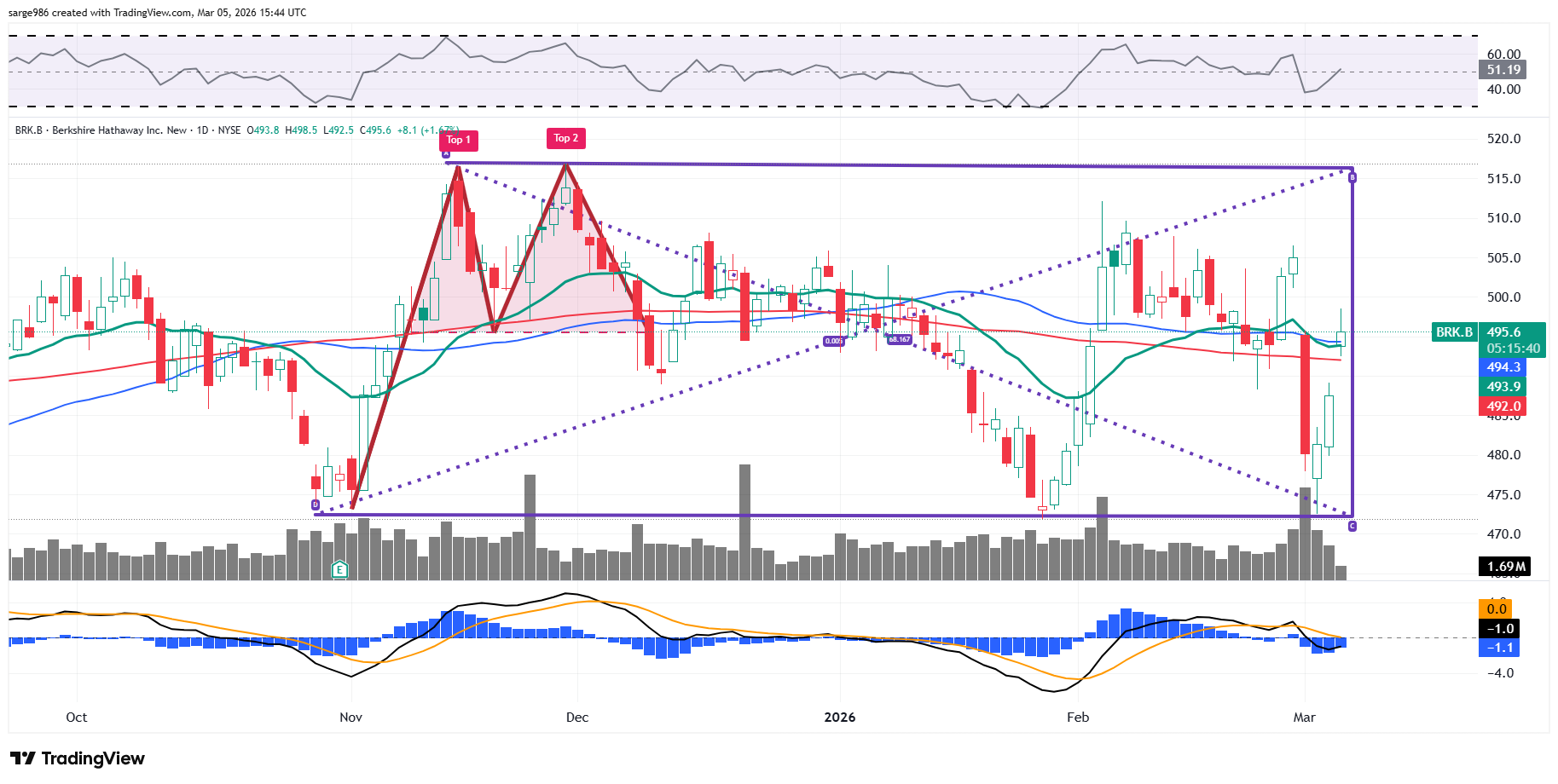 BRK.B has been in rally mode for a few days, after reporting, over the weekend, a 30%-ish drop in operating earnings and surge in the firm's cash pile during the fourth quarter. The culprit? The firm's insurance underwriting segment generated a 54% contraction in operating earnings