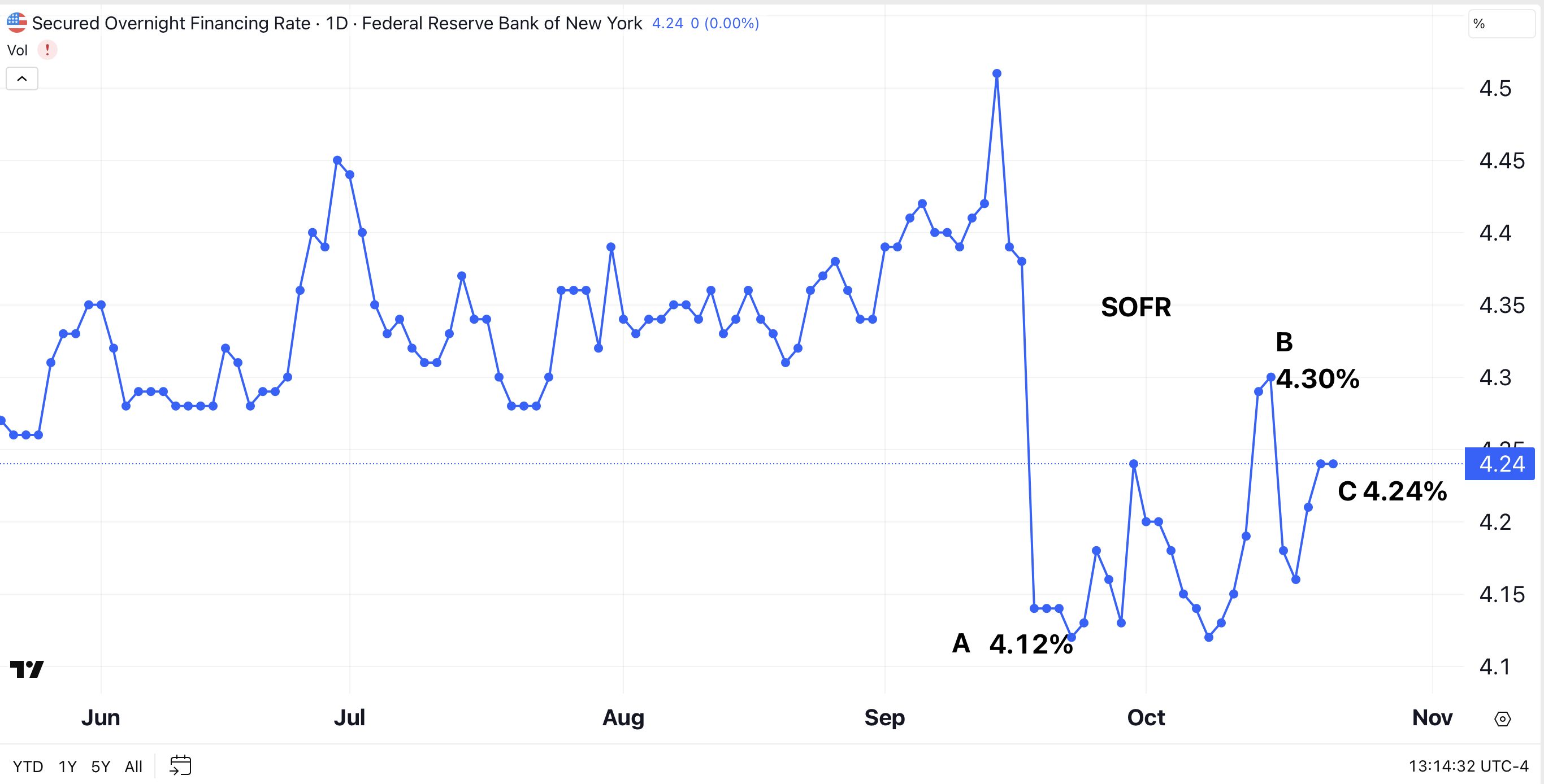 Fortunately, SOFR has receded. SOFR fell to 4.24% on Monday after bouncing around for about a week.
