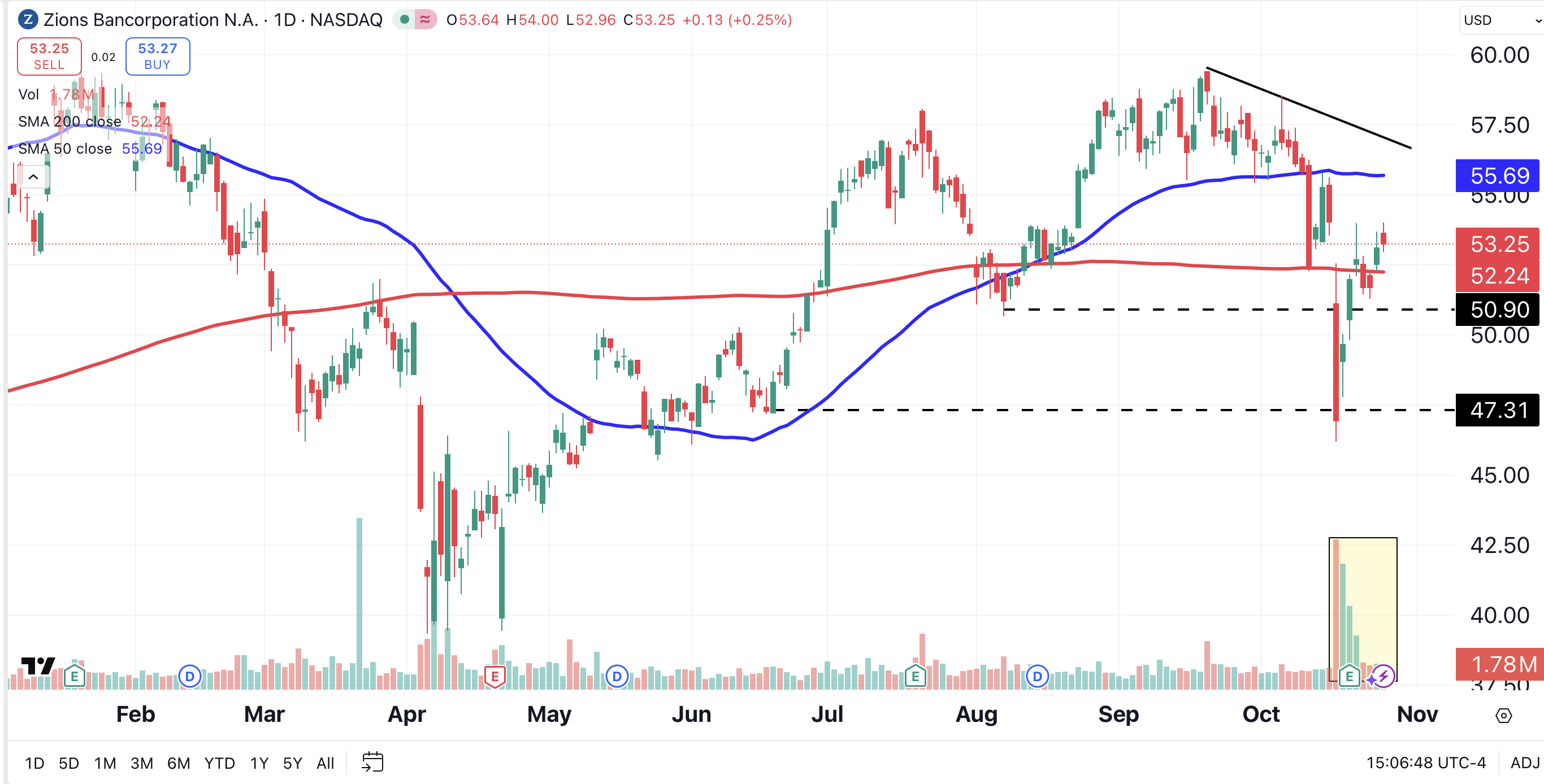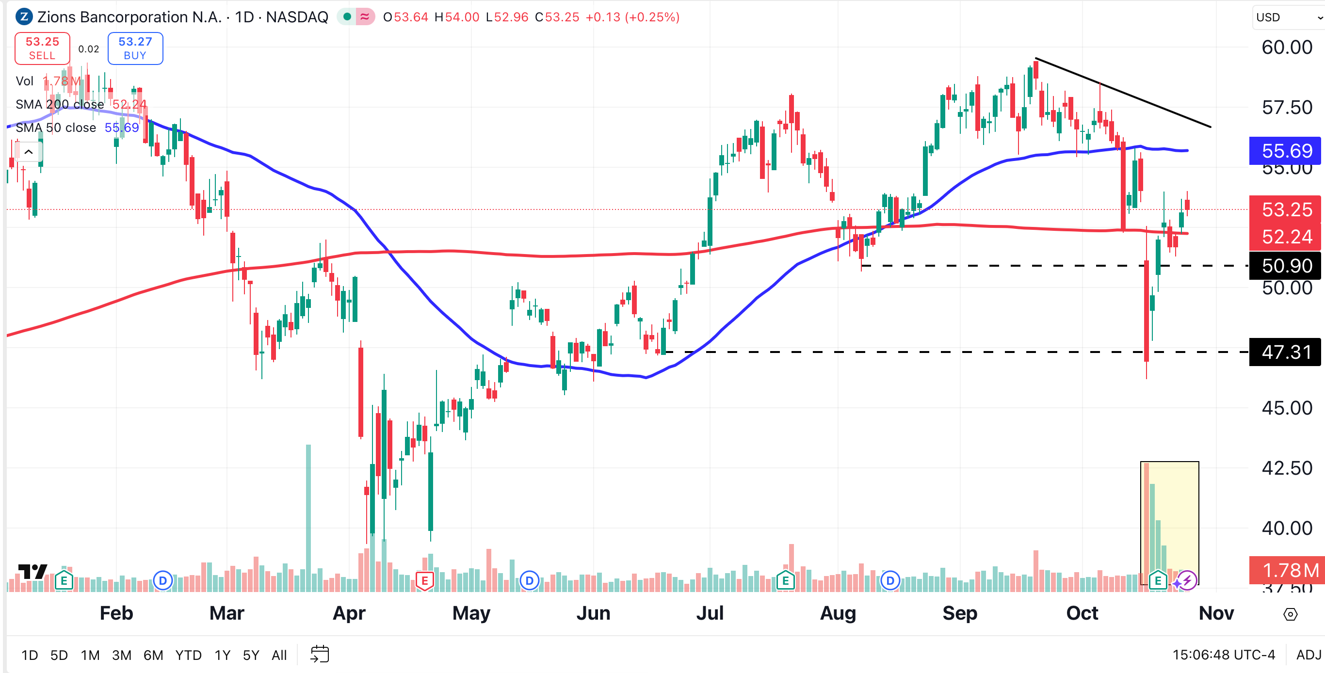 ZION has barely managed to climb above its 200-day moving average (red, $52.24). The stock’s 50-day MA (blue), at $55.69, lies below its bearish trend line (solid black line), which stands near $57. Both the 50-day MA and the trend line are obstacles that may prove difficult to surmount.