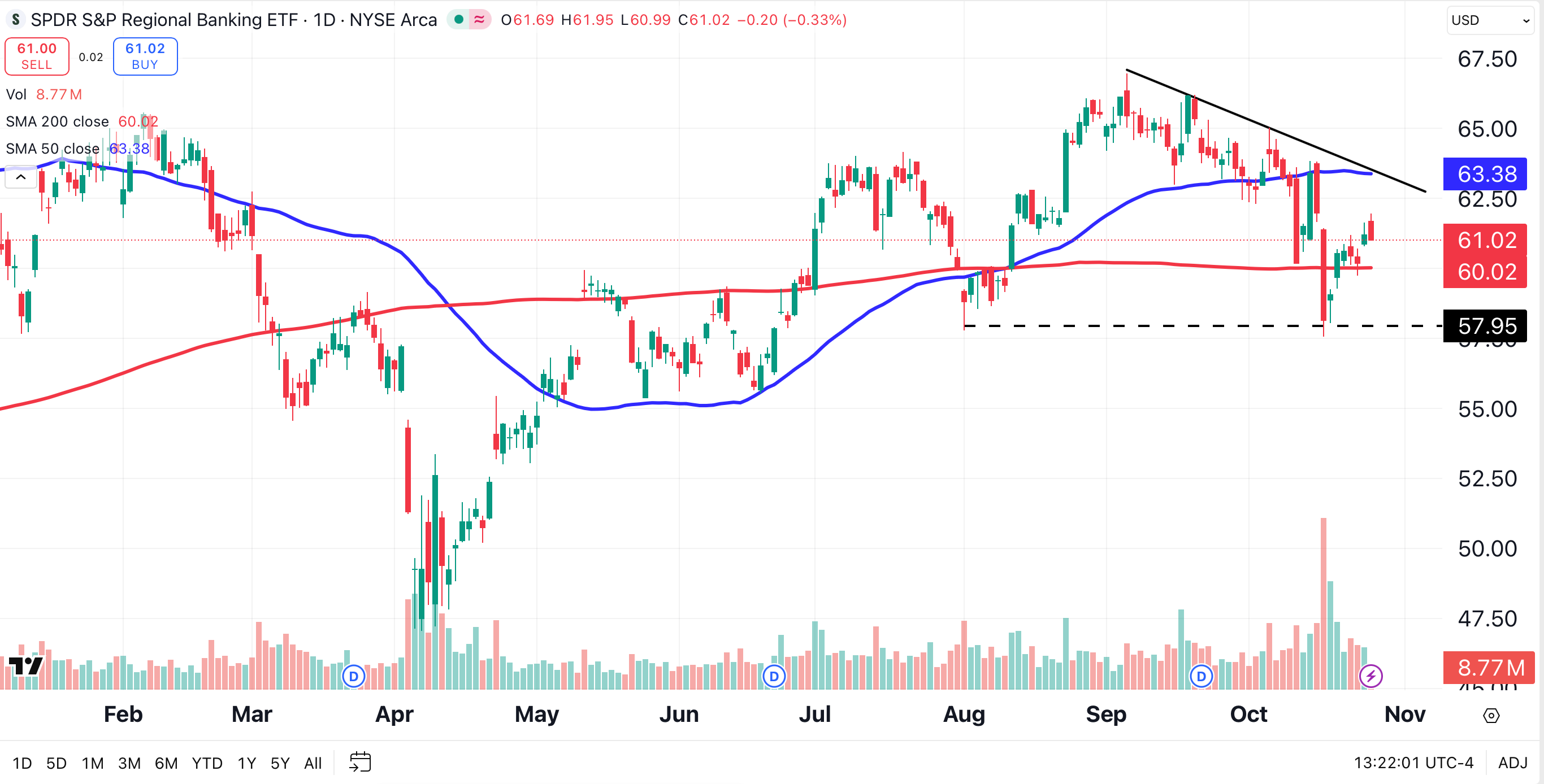 I’m not convinced that the banking sector is in the clear. Note the location of KRE’s 50-day moving average (blue), and how it coincides with a bearish descending trendline (solid black line). Based on the chart, $63.25 seems like a good place to sell the S&P Regional Banking ETF.