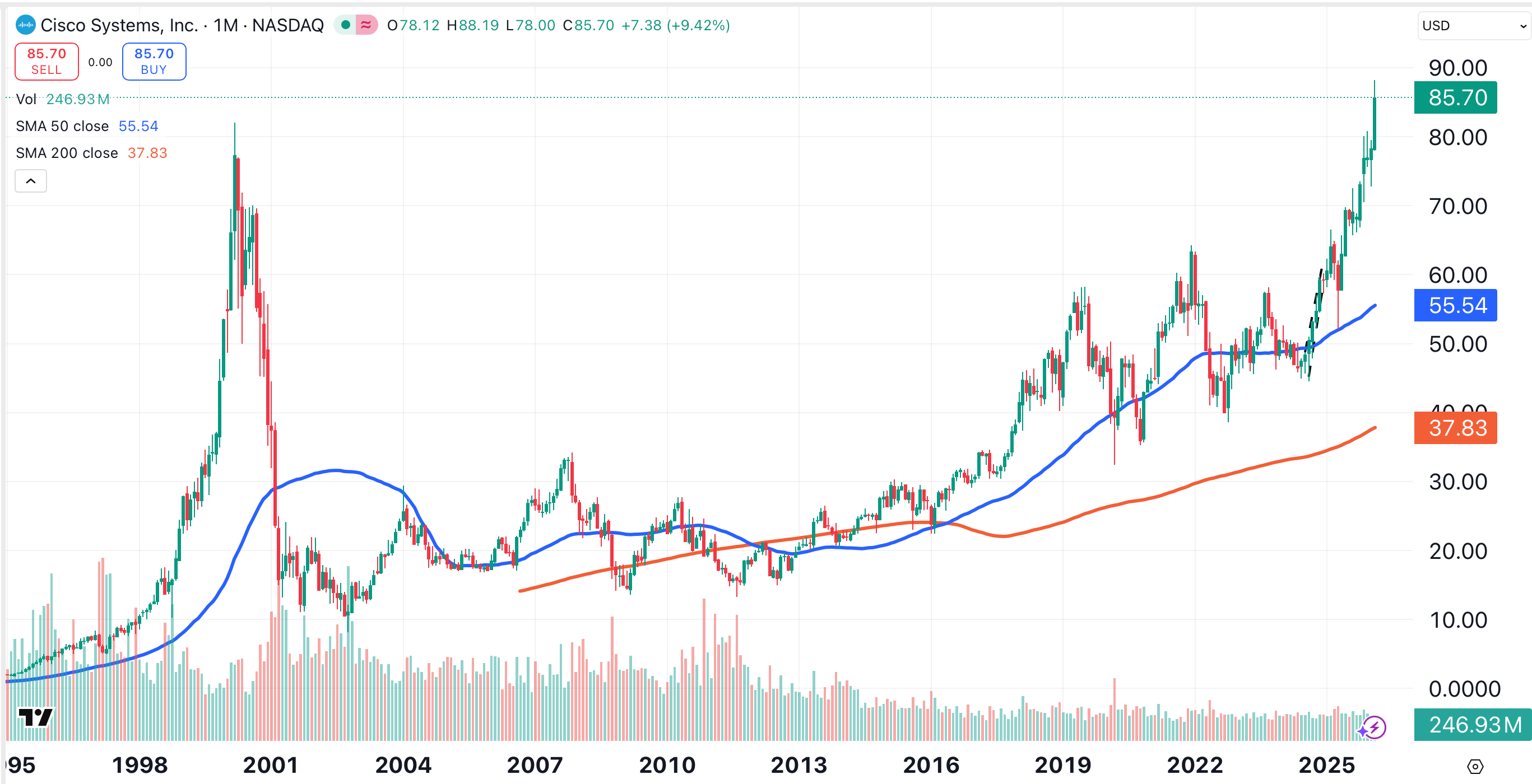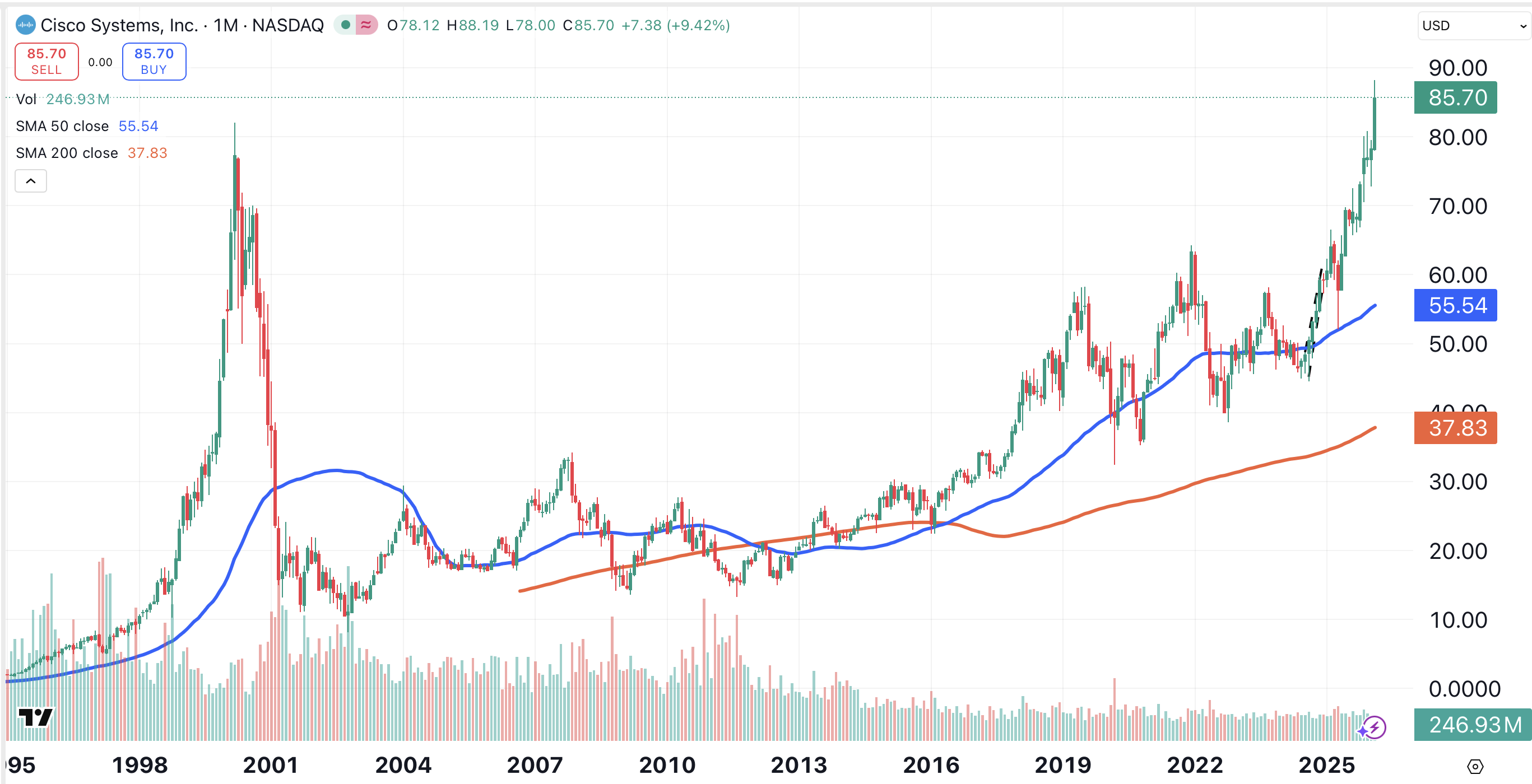 Cisco would spend the next 25 years trying to break even. Last week, the stock finally climbed above its former all-time high, set in March of 2000.