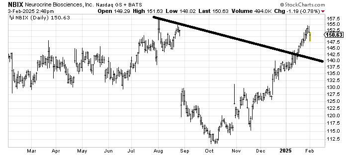 Neurocrine Biosciences NBIX looks vulnerable to me all the way back to that line. Let’s call the line 140-ish, but know that the longer it takes (without making a higher high), the lower that number is since the line is down-slanting.