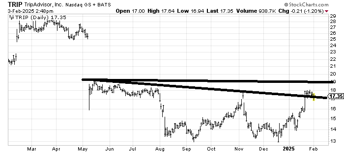 Trip Advisor TRIP looks like it is trying to build a base. Full disclosure: I am biased against this stock, though. Every time I have traded it, thinking it’s a base, I’ve gotten a pop and drop. Maybe you shouldn’t trust it unless/until it gets over 19. Use a stop under 16.