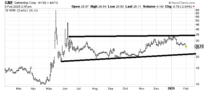 Let’s call Gamestop GME another chart in a wide range. All of these charts are the same: you buy the low end of the range and sell the top. Until something changes in that pattern, that’s the trade.