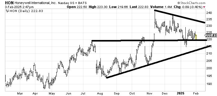 I really want to like Honeywell HON because it had that terrific breakout in November, but then it leaked all the way down, giving up more than the gap up. I think 215-220 is decent support, so it's a good area to pick some up. However, there is resistance all the way up, so hard to imagine it can fly easily. Probably a slow go.