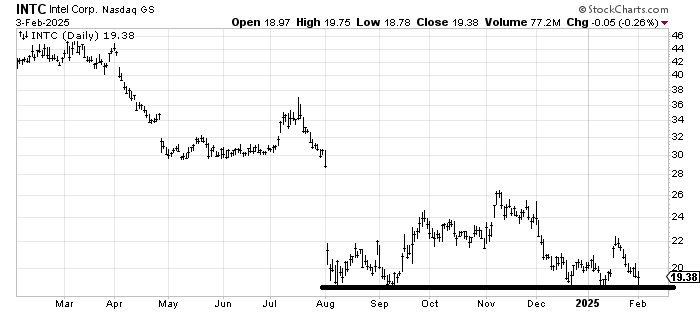 I don’t know why Intel INTC keeps holding at this 18-19 area but it does. I was asked about it and all I can say is that as long as it holds that level, it’s probably okay to buy but the chart looks like it’s going nowhere. A break of 18-ish would probably also see the SOX break that lower line.