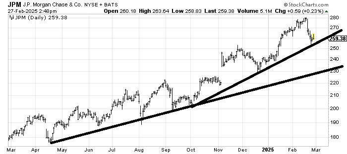 JPMorgan Chase JPM is trying to hold that shorter-term uptrend line. While I don’t think a break of it takes it down to the lower line quickly, that 230 area would be the next support area. If it waits a month or so to get there that number rises to 240.