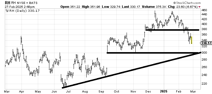 Now that RH RH broke 380, it measures to 300, and possibly the gap fill at 260. There will be support at 300, though so I would expect a bounce from there.