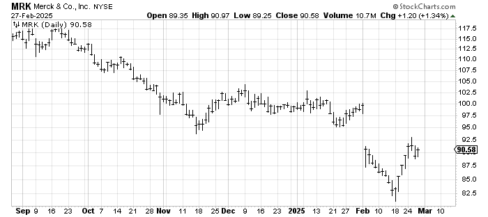 I was asked to follow up on Merck MRK, which I thought would bounce, but not this much. I then thought it could come back down to form a W. That is still a possibility, but the fact that it got into the gap tells me it is likely to fill it.
