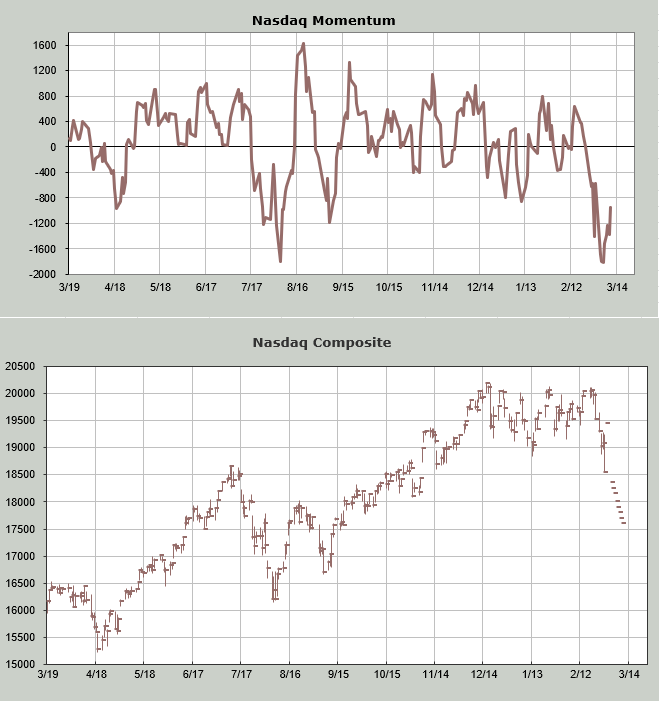 Speaking of next week, my own oscillator will get oversold around midweek next week. But I also decided it was time to do a what-if for the Nasdaq Momentum Indicator. Earlier this week I noted that it was too far away for us to consider an oversold condition. Now I can tell you that when I plug in lower closes, walking Nasdaq down nearly one thousand points over the next week we find the Momentum Indicator no longer goes down beginning Wednesday, March 5th. As a reminder, the exact day is not nearly as important as the general time frame, and we are now getting much closer.