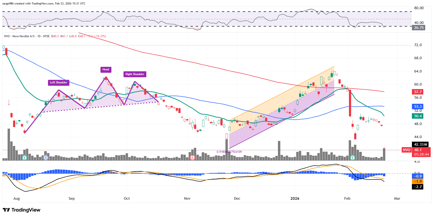 NVO is now trading at 2021 levels. The stock has more or less, with the exception of a couple of brief rallies, been in decline since June 2024. Clearly, there is a huge gap in performance between this stock and the shares of LLY that are up roughly 25% over that same period. ​