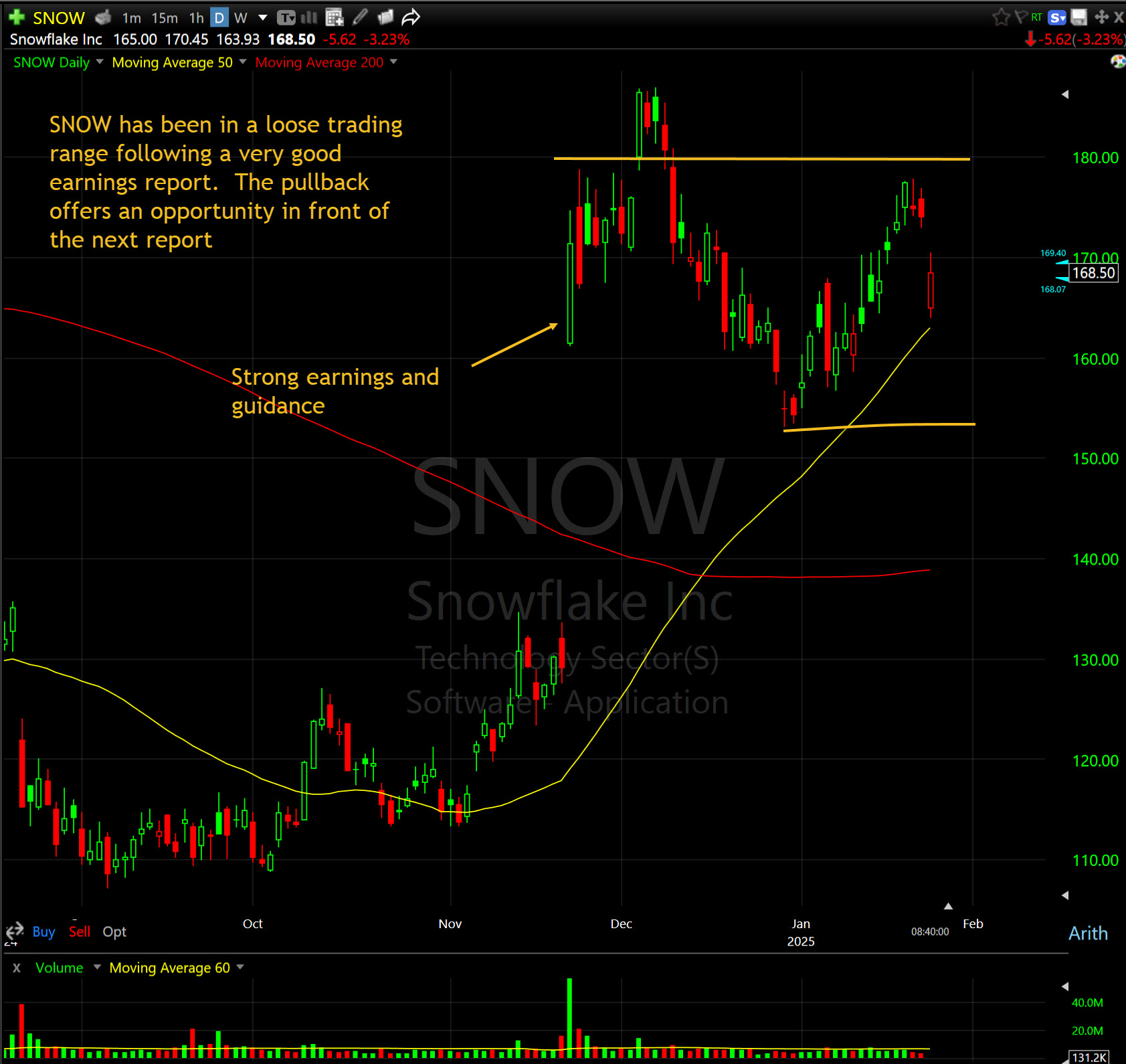 Earnings are due out around February 26, and it is likely the market will anticipate another strong quarter. The volatility being created by DeepSeek looks like an opportunity since cheaper large-language AI is likely to create more business for SNOW.