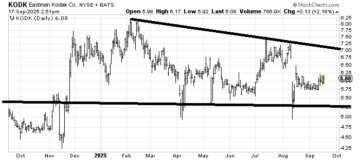 I really thought Eastman Kodak KODK had gone away, but it turns out it hasn’t. The stock hasn’t gone anywhere in nearly a year, which would make me warm up to it, but quite frankly, if it rallies, it’s probably because it’s become a meme stock. That having been said, the range looks to be 5.25 to 7.25.