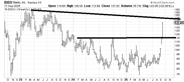 When I recommended Baidu BIDU a few weeks ago, I did not expect it to be up 40% so quickly. This is a weekly chart (3 years), and there is a next measured target of 135-140 and a downtrend line that comes in around 145. If you wanted to take a little something off the table, I wouldn’t blame you at all. It needs a rest.