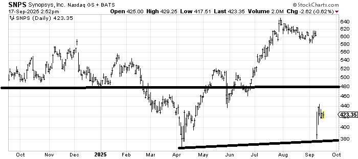 Synposys SNPS took a hit, and while I believe spike lows tend to hold on the first trip back down (and therefore the stock would be buyable for a trade should it come down there) I think there is a lot of resistance all the way back up in this chart. I’d wait for a pattern to set up before I feel comfortable buying it without watching every tick.