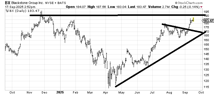 Blackstone BX is not my kind of chart with that old high still on the chart and support quite far away at 165-170. If the chart came down nearer support, I would take a stab at it because the risk/reward would be better (knowing you are wrong with a crack under that uptrend line.